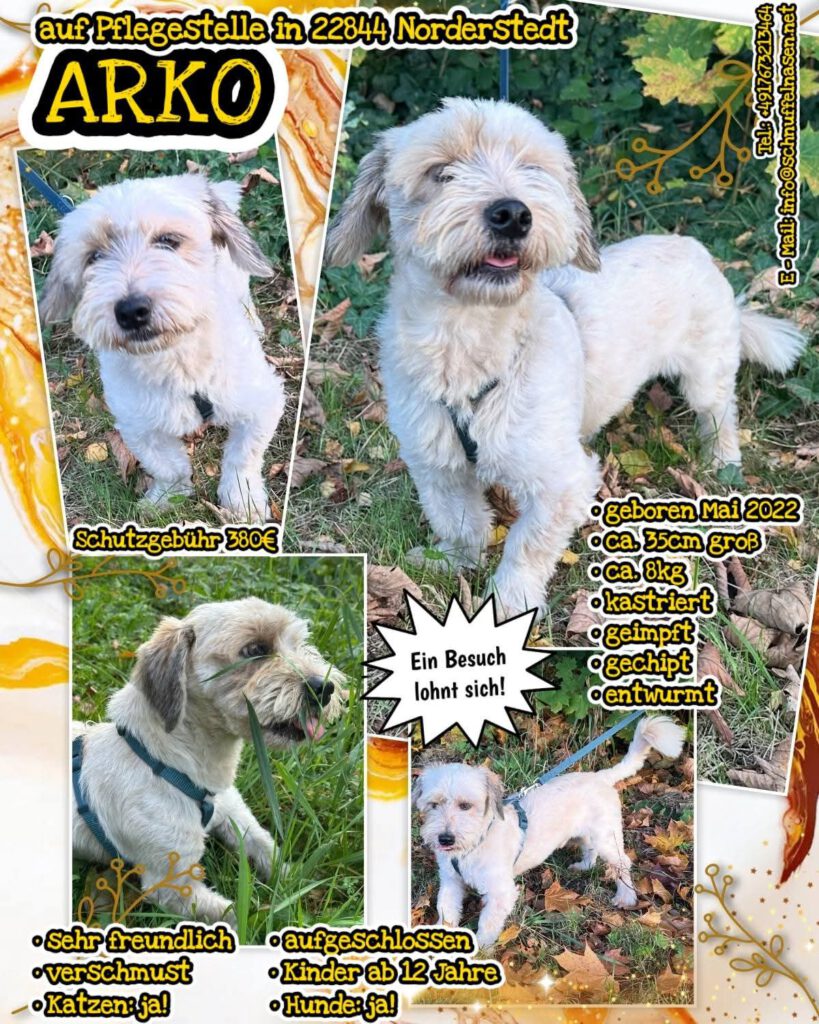 Arko ist ein kleiner Wirbelwind mit einem riesengroßen Herz. Mit seinen etwa 35cm Schulterhöhe und 8kg bringt er genau die richtige Portion Charme und Energie mit, um jedermann im Sturm zu erobern. Geboren am 21. Mai 2022, ist er noch jung, voller Neugier und Tatendrang – bereit, die Welt an deiner Seite zu entdecken.