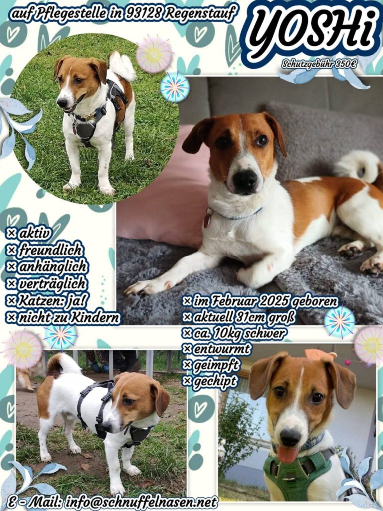 Yoshi ist ein liebenswertes, anhängliches und aktives Kerlchen, dessen Jack Russel (Mix) – Gene nicht zu leugnen sind!